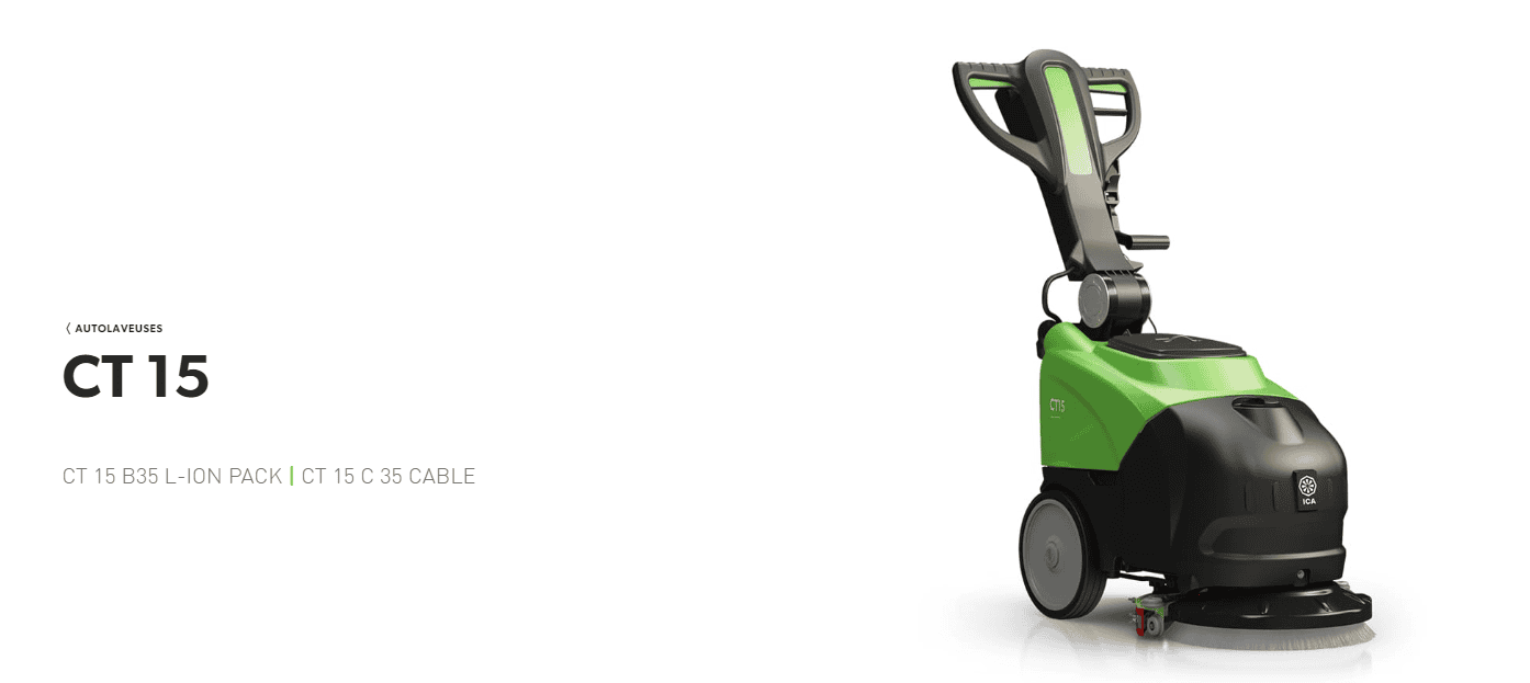 Ses dimensions compactes permettent un usage dans les espaces publics des hôpitaux ou dans les cuisines des restaurants et des hôtels. L’autolaveuse autotractée ICA CT15, est également appréciée pour nettoyer les débris de travaux dans les ateliers ou les garages. Le concepteur ICA a facilité l’utilisation de cette autolaveuse tractée, grâce à la présence d’un panneau avec touches mémorisant des programmes de travail prédéfinis et à un timon rabattable et réglable en hauteur de 50 à 1 200 cm. La puissance installée du moteur des brosses est égale à 550 W, tandis que la pression de la brosse est de 25 kg.