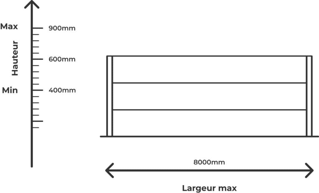 Les barrières BAFAV complètes peuvent être livrées jusqu’à 8 mètres selon la hauteur. Les éléments nécessitent une fondation en béton de niveau de 15 à 20 cm. il est conseillé de fixer la barrière sur ses plaques de charge avec des boulons d’ancrage à la fondation.