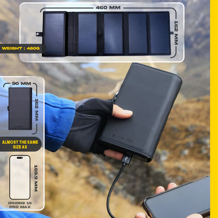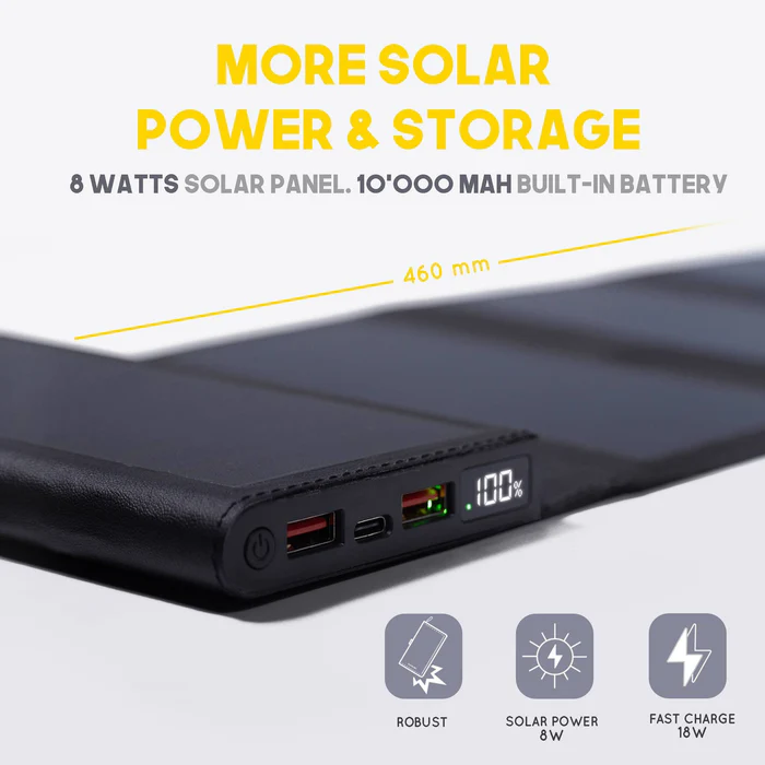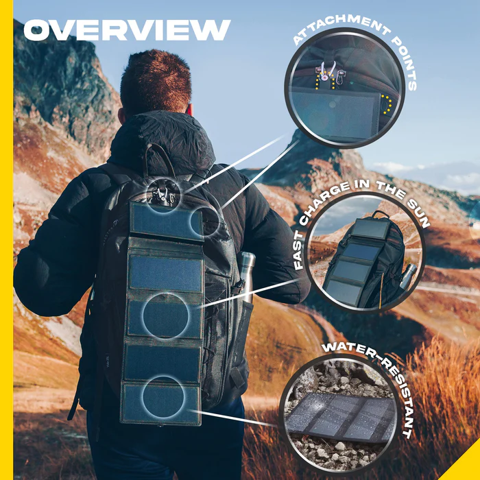 Équipé de 5 panneaux solaires de haute efficacité et d’une puissante batterie intégrée, ce bijou technologique vous permettra de recharger rapidement et sans interruption tous vos appareils lors de vos randonnées et de vos aventures en plein air