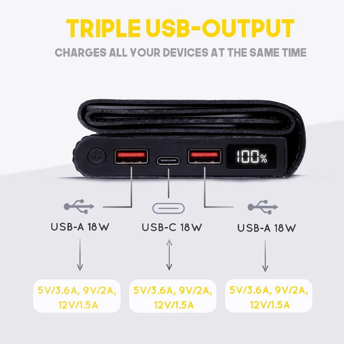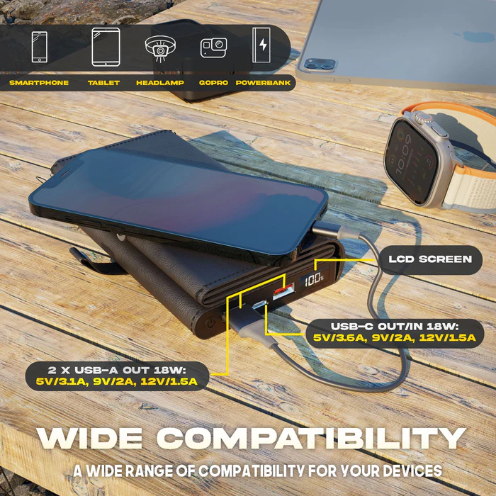 Les sorties USB-A et USB-C vous permettront de charger efficacement les téléphones, tablettes et ordinateurs portables équipés d’un port de charge USB-C ou Micro-USB. La sortie AC : 4 x 2400W – 220V vous permet d’alimenter des appareils qui ne peuvent pas être chargés à l’aide de ports USB, comme certains ordinateurs portables, les drones, les petites glacières et bien plus encore. La prise secteur universelle permet également une compatibilité mondiale avec tout appareil nécessitant moins de 2400W.