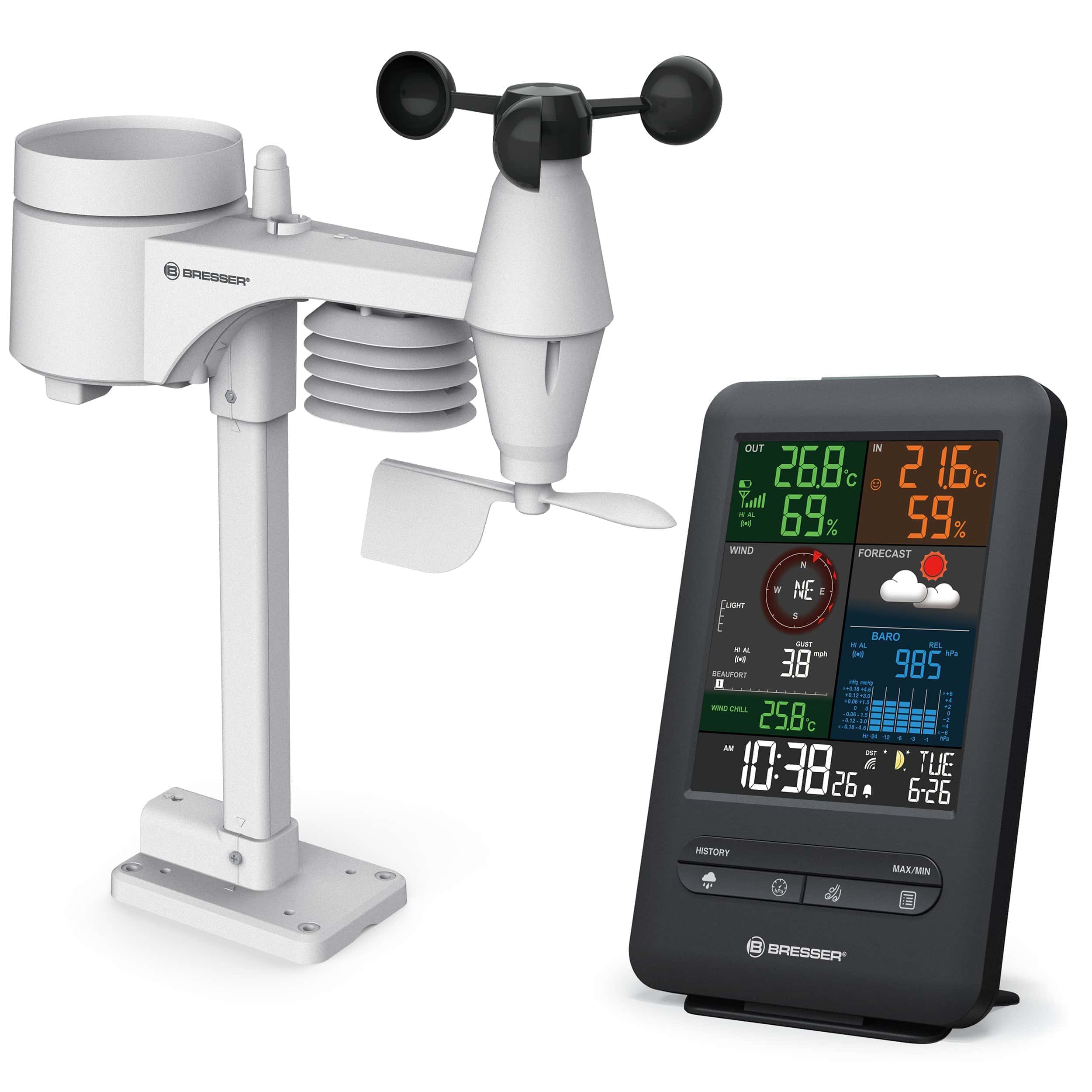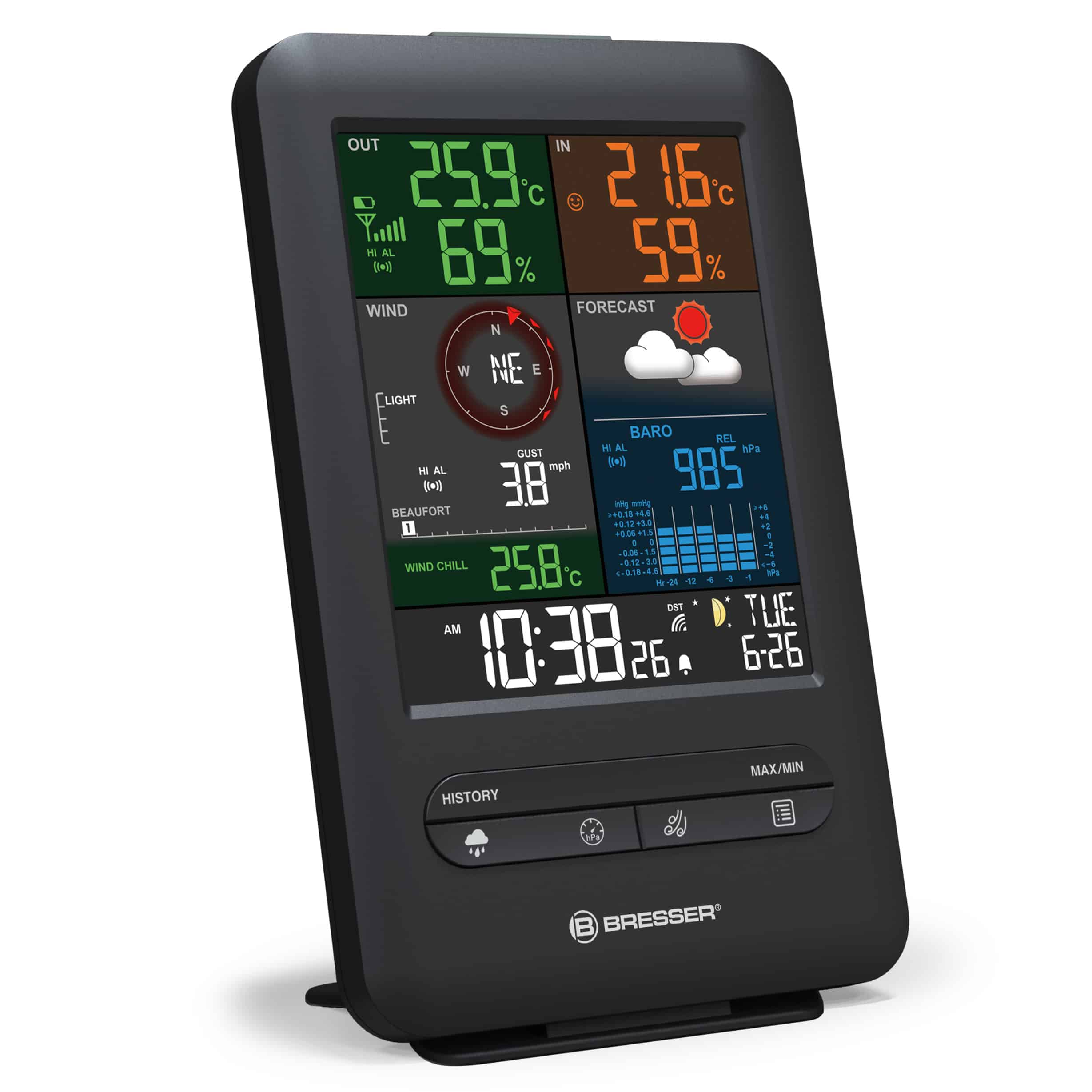 Avec la centrale météo 5-en-1 Beaufort de BRESSER, la météo est toujours affichée de manière organisée et en couleur sur votre écran En outre, la station météo est dotée d’un grand écran avec une disposition astucieuse pour pouvoir vérifier rapidement le temps en un coup d’œil.