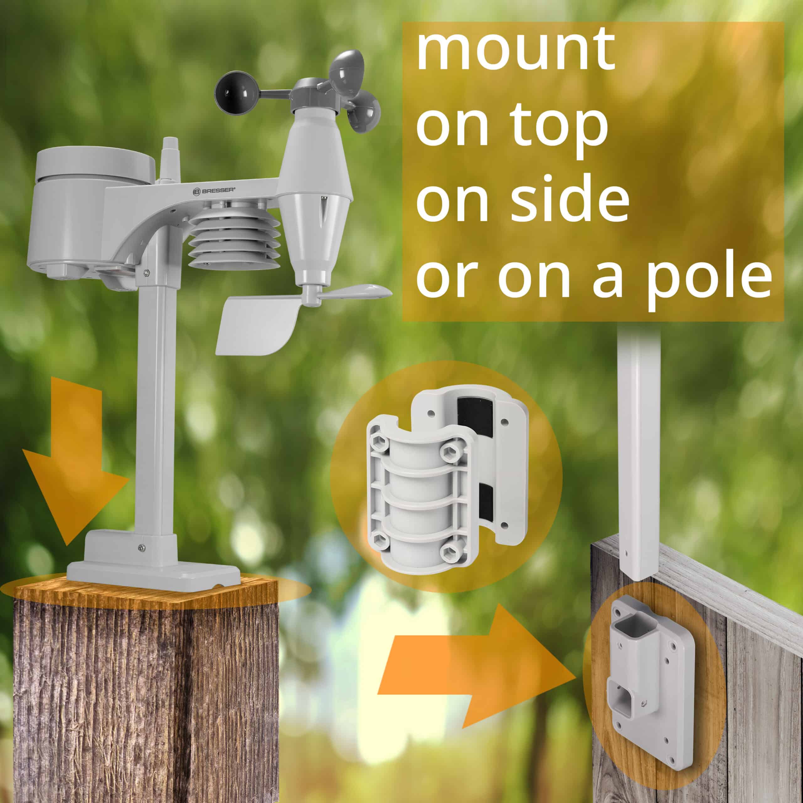 La nouvelle centrale météorologique BRESSER 5-en-1 combine de manière unique un design compact avec l’affichage d’un grand nombre d’informations. Le capteur extérieur compact et multifonctionnel nécessite peu d’espace et peut donc être placé presque n’importe où. Un collier de serrage et des vis pour fixation sur poteaux (diamètre du tube d’environ 25 à 33 mm) ainsi qu’un support sont déjà inclus !