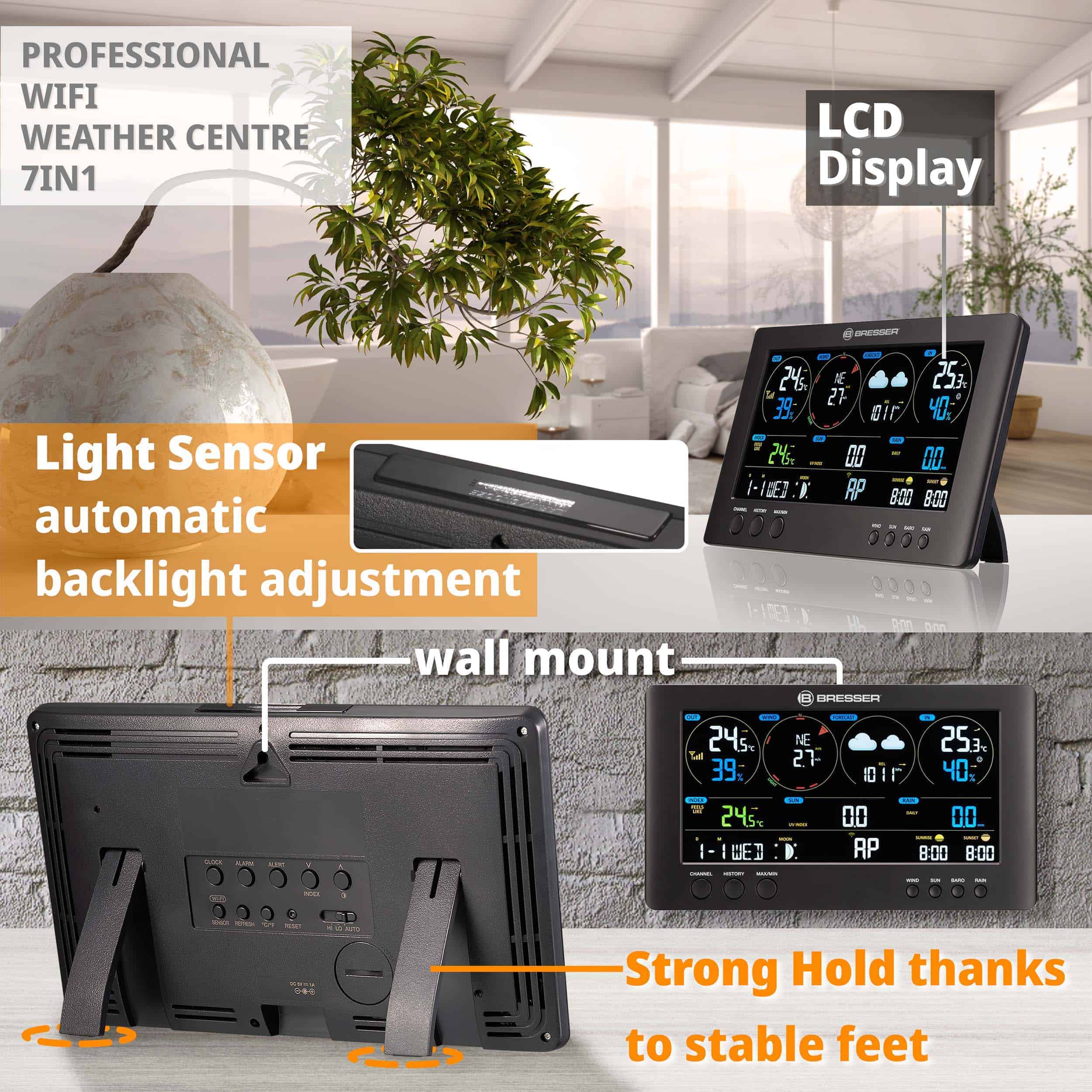 La nouvelle centrale météo BRESSER WIFI ClearView avec capteur 7 en 1 offre une gamme très complète de données météorologiques. Le capteur extérieur multifonctionnel peut être facilement installé avec les accessoires de montage inclus! Le capteur extérieur transmet de manière fiable les valeurs mesurées pour la vitesse du vent, la direction du vent, l’humidité, la température, les précipitations , ainsi que le niveau UV et l’intensité lumineuse via une fréquence de 868 MHz à la station de base.
