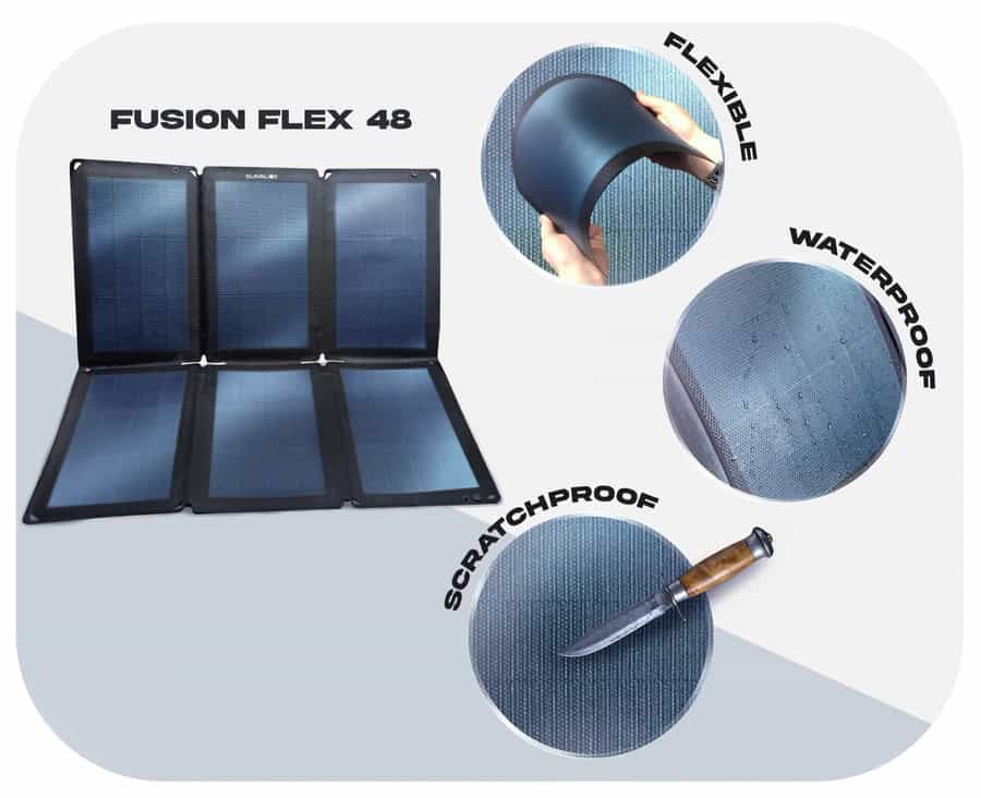 Avec un poids de 900 grammes et un format A4 pliable, le panneau solaire Fusion Flex 48 est parfait pour les campeurs, les amoureux de la nature et tous les aventuriers qui recherchent une puissance élevée tout en restant compacts et légers. Les panneaux flexibles ne mesurent qu’un millimètre d’épaisseur, ce qui signifie qu’ils peuvent facilement être glissés dans un sac à dos de voyage, ne prenant que très peu de place.