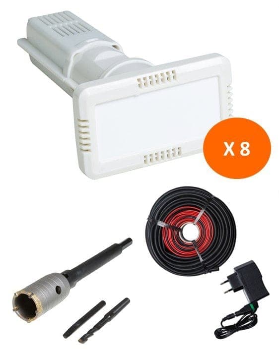 Grâce à ce kit complet, vous avez tous le matériel pour réaliser votre chantier et traiter jusque 6.5 mètres de mur humides. Quel que soit le matériau (brique, parpaing, béton, pierre, moellons, ….) cet appareil va extraire l’humidité du mur, le déshumidifier, l’assainir. Après 2 à 6 mois (selon le matériau et l’épaisseur du mur), votre mur sera à nouveau sec et prêt à être rénové.